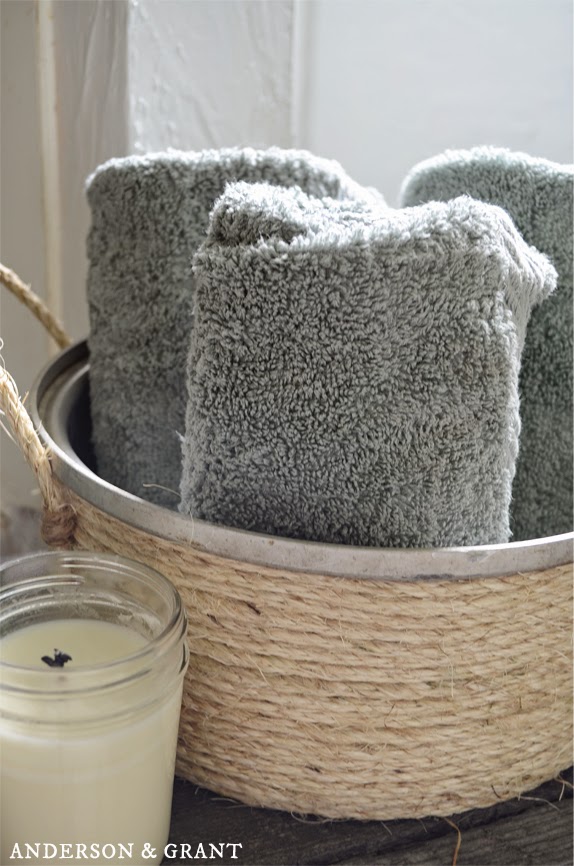 There’s so much pretty inspiration for bathrooms in blogland and I’ve been pinning away like crazy on Pinterest! Here’s a great idea for storing towels from my sweet friend Jamie at Anderson + Grant. You’ll have to pop over to her blog to see how she made this “basket”. We definitely want to stay on budget with this makeover and I love the idea or reusing or repurposing an old item and making it into something pretty and function like Jamie did!